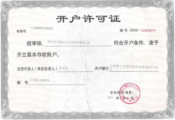 棗莊市英特信息網(wǎng)絡(luò)有限公司已經(jīng)三證合一了,下面是公司的新營業(yè)執(zhí)照的副本。棗莊市英特信息網(wǎng)絡(luò)有限公司營業(yè)執(zhí)照(統(tǒng)一社會(huì)信用代碼:91370402863129563Y)